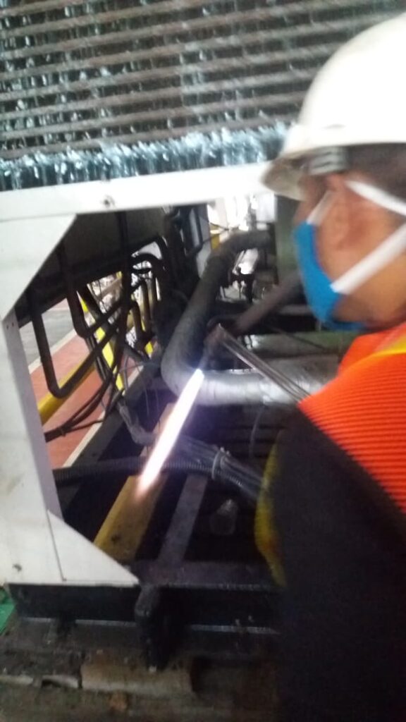 Pekerjaan perbaikan sistem pendingin dengan metode brazing pada pipa refrigerant untuk memastikan sistem kembali kedap, aman, dan berfungsi optimal sesuai standar teknis.